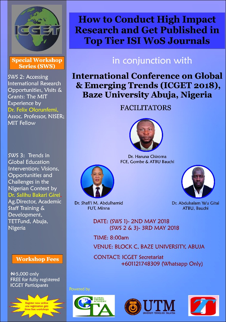 On behalf of the local and international organizing committees and all committee chairs, we feel honored and delighted to welcome you to the International Conference on Global & Emerging Trends (ICGET) holding 2-4 May, 2018 at Baze University, Abuja, Nigeria. We also seize the opportunity to welcome you to Nigeria, the largest country in West Africa. It is an opportunity for you to experience first-hand, the Nigerian exceptional hospitality and to savour the breath-taking scenery of Abuja, the nation’s Federal Capital Territory and the seat of the Nigerian federal government, at Aso Rock. The venue had been carefully chosen so you can have an unforgettable experience. The keynote speeches, invited talks, tutorials and workshop sessions are designed to inspire and enrich participants, and foster lasting national and international collaborations. We look forward to new ideas and qualitative inputs that will result from the technical paper presentations in the parallel oral and poster sessions. We hope that participants will take advantage of all formal and informal sessions to build memorable connections that can contribute to global trends across various fields. Participants will be privileged to have a taste of the rich Nigerian culture, music, and dance, during the cocktail session. We look forward to welcoming you to Nigeria, the Giant of Africa.